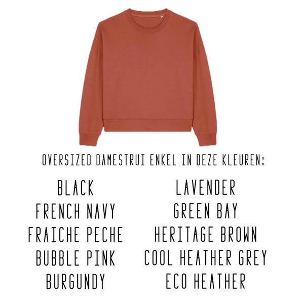 Onze basistrui en hoodie zijn in alle kleuren verkrijgbaar. De oversized damestrui en trui met rits niet in àlle kleuren. Moest jouw kleurkeuze niet lukken, contacteer ik je om een oplossing te zoeken.